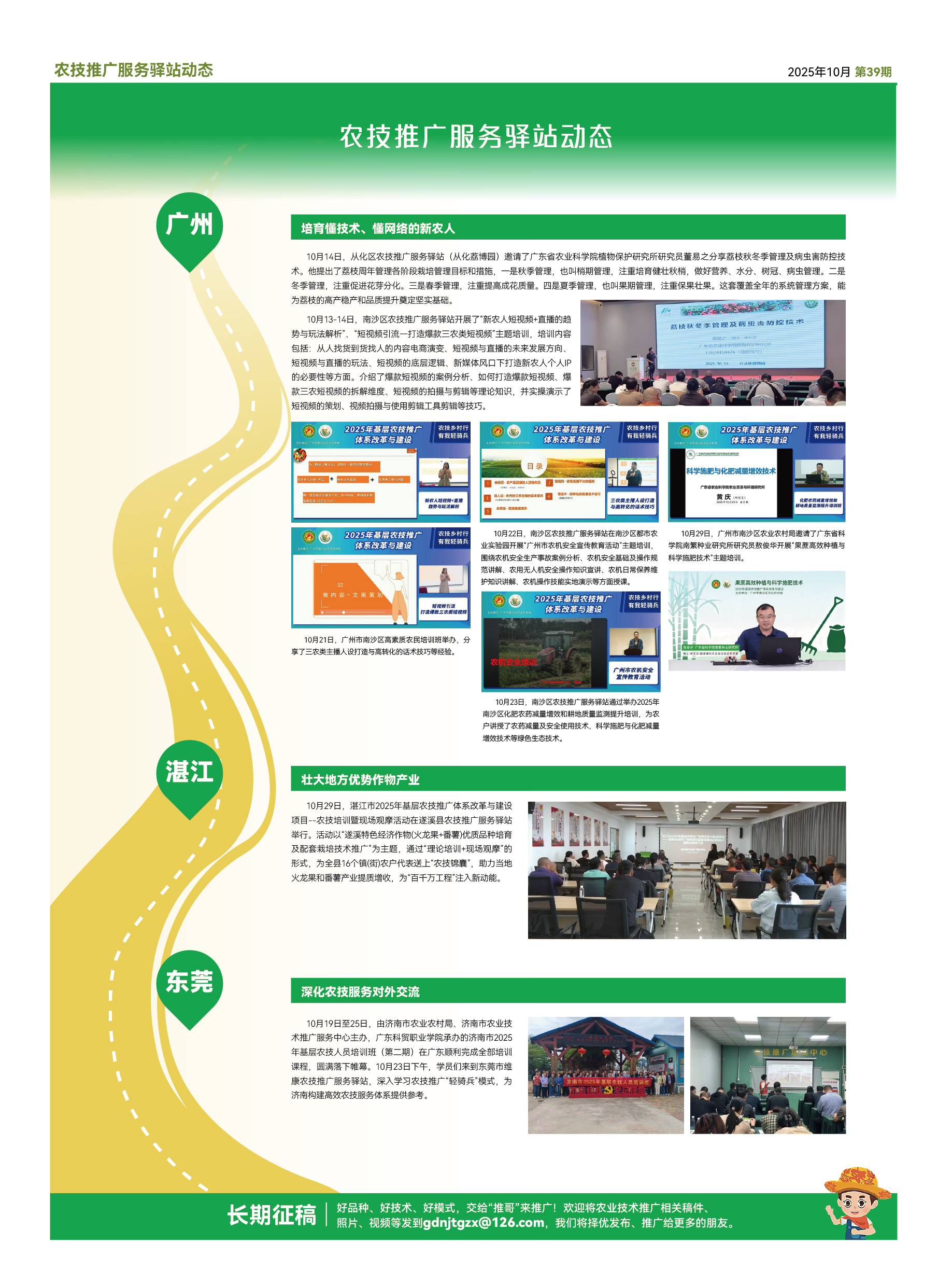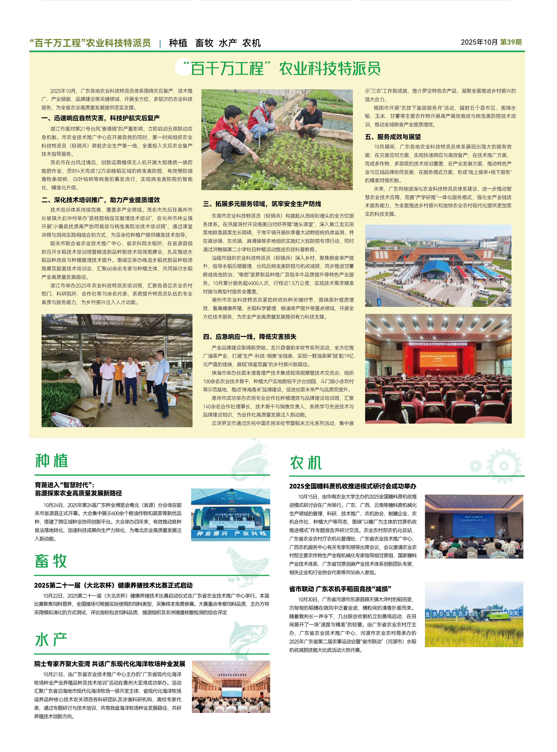 2025年10月,广东各地农业科技特派员围绕灾后复产、技术推广、产业赋能、品牌建设等关键领域,开展全方位、多层次的农业科技服务,为全省农业高质量发展提供坚实支撑。