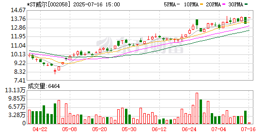 受拟购紫江新材51%股份消息影响,7月16日,*ST威尔“一”字涨停,当日收于涨停价13.89元/股,总市值19.92亿元,当日成交金额898万元。